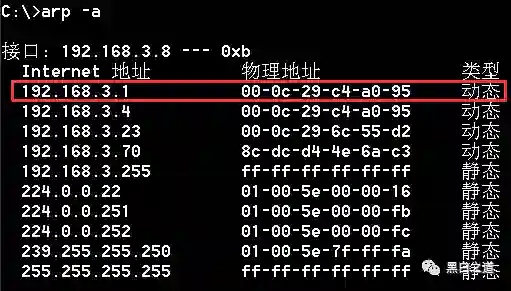 再次,回到被嗅探的目标机器上观察毒化后的网关mac变成了多少
