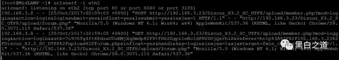 尝试利用urlsnarf截获目标的http url访问记录,主要是想看看目标内网还有没有其它的web之类的,抓到密码以后好针对性的下手,如果内容太多看着比较乱,可以使用-v选项指定过滤正则