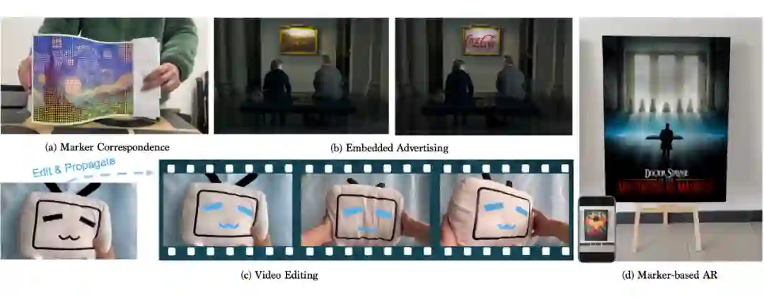 之间的像素级对应关系(Marker Correspondence),这将带来一系列新的有意思的应用。如图(b)所示,可以将一个电视剧或电影中所有片段拍到的某幅画替换成一个植入式广告;如图(c)所示,可以编辑一个视频中的一帧图像并通过 NeuralMarker 将编辑效果扩展到整个视频上,这能大幅的增加视频编辑效率;如图(d)所示,可以实现 Marker AR 效果。