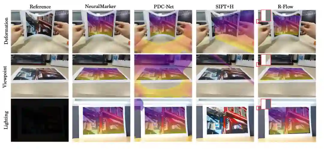 这种方法最大的问题是:1)单应性矩阵假设 Marker 仍是平面没有发生形变;2)稀疏特征只利用了部分图像信息因此不够稳定和精确,比如受重复纹理、光照变化影响较大。本文提出一套框架 NeuralMarker 通过训练一个深度神经网络直接端到端估计 Marker Correspondence。为了评价 Marker Correspondence 估计的质量,本文也提出一个新的 DVL-Markers Benchmark 和对应的评估方式。