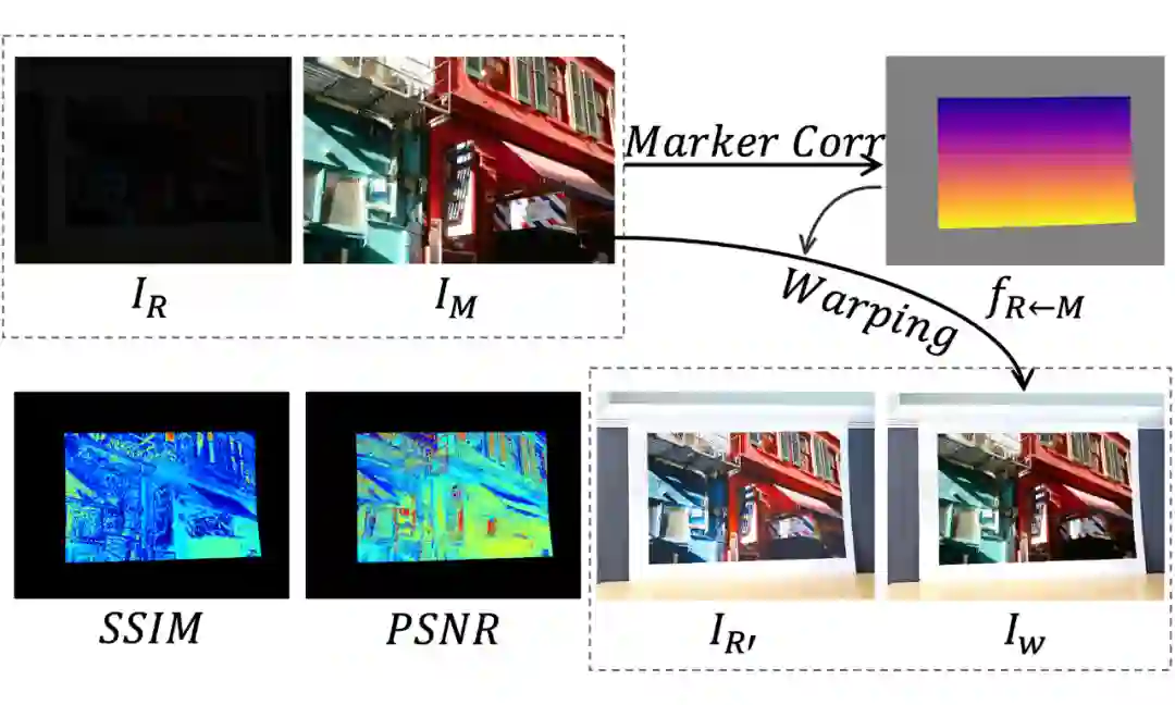 量化评估 Marker Correspondence 面临与准备真实图像训练数据时同样的问题:无法获得稠密的真值。本文因此提出将原 Marker 通过估计的 Marker Correspondence 投影到目标图像上,然后计算投影区域与测试图像的一致性 SSIM 与 PSNR。
