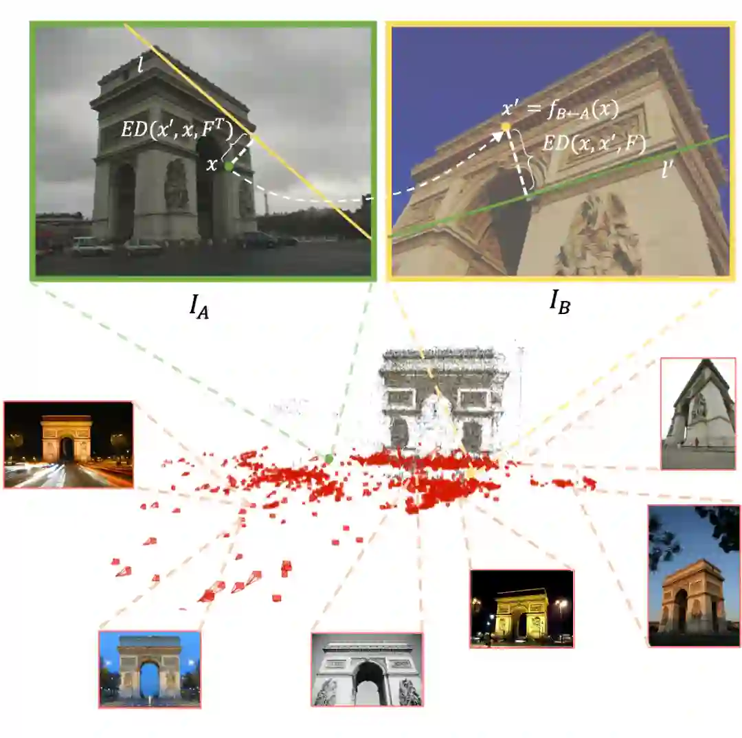如上图所示,SfM 数据集能将一个场景中不同光照下拍摄的图像的相机位姿恢复。根据多视图几何,给定两张图像相对相机位姿的情况下,一张图像上的像素