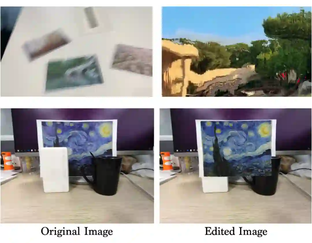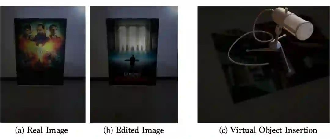 NeuralMarker 对各种现实环境的干扰因素,如光照变化、极端视角变化、Marker 形变等有较强的鲁棒性,这使得我们有更广阔的的应用空间。如下图所示,在暗光条件下也能实现 AR 效果。(a)(b)在与 NIID-Net 结合的情况下可以在暗光条件下进行保真实感的图像编辑,(c)也可以在暗光场景中根据估计的 Marker 位置插入虚拟物体。