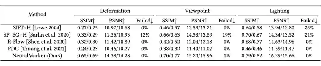 本文使用 SSIM 与 PSNR 的均值/中位数 单应性矩阵估计要求至少有四个对应点,否则无法估计出该矩阵,因此 SIFT+H 与 SP+SG+H 在太具挑战的条件下无法出解(Failed)。SIFT 特征在形变和视角变化时比 SP+SG 更鲁棒,但是对光照变化更脆弱。RANSAC-Flow 与 PDC-Net 总能出解,但是对这几个扰动因素仍然比较脆弱。NeuralMarker 在所有方法中都展现出了卓越的精度和鲁棒性,尽管 RANSAC-Flow 对光照变化也比较鲁棒但是仍然比 NeuralMarker 要差。