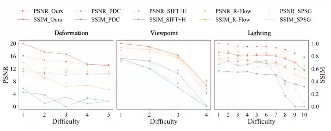 DVL-Markers 根据三种因素的难度进一步划分子集,形变、视角变化、和光照变化分别被划分为 5、4 和 10 种难度(细节请查看原文)。如下图所示 NeuralMarker 在所有难度登记上都展现出更好的精度,尤其是在高难度区域展现出相对更好的性能。