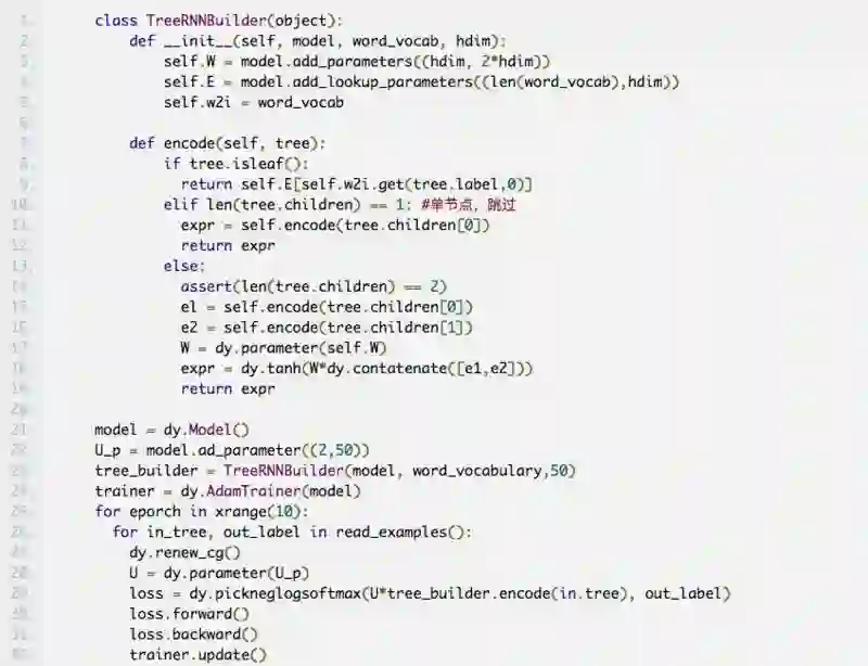 向模型里增加必要的参数(Parameters)和查找表参数(LookupParameters)。创建一个训练器(Trainer)对象,并使之与模型(Model)相关联。