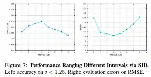 图6 用SID将深度值离散化成多个区间,在40~120个区间中,DORN得分范围为[0.908,0.915], δ < 1.25,在RMSE方面得分为[3.056,3.125],因此对一个较长的区间数是鲁棒的。