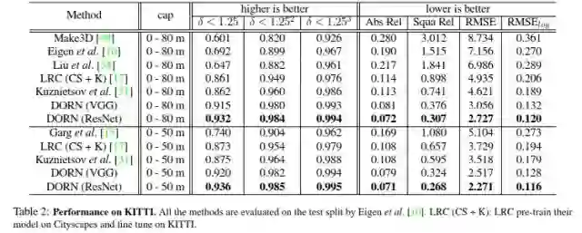 表4 深度离散化和有序回归。根据表中的得分可知,对连续深度的回归训练似乎比其他两种方法收敛的更差,我们的有序回归网络的性能最好。SID和UD离散化有很明显的区别,且用BerHu代替我们的有序回归损失时,DORN仍然能得到更高的分数。