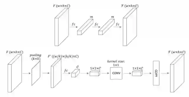 首先用一个小内核和步长的平均池化层来降低空间维度,然后用一个fc层来获得维度为C的特征矢量,把它看做空间维度为1*1的C通道的特征地图,并加入一个内核大小1*1的卷积层来作为跨通道参数池化结构。最后我们沿着空间维度将特征向量复制到F,这样F的每个位置都对整个图像有相同的理解。