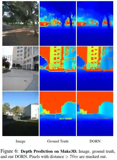 单目的深度估计作为理解3D场景几何的重要部分,其求解是一个不适定问题。利用深度卷积神经网络(DCNNs)获取的影像级信息和分层特征,目前的解决方法已有很大进步。这些方法把深度估计建模为一个回归问题,并且用均方差最小化来训练回归网络,但缓慢的收敛速度和不理想的局域解都会对其产生影响。另外,现有的深度估计网络采用重复空间池化,会导致不理想的低分辨率特征图。为了获得高分辨的深度图,需要跳连接层或者多层去卷积的网络,这使得网路训练变得复杂,消耗更多的计算量。为了消除或者至少很大程度地减少这些问题,本文引入一个空间增加离散化(SID)策略来离散化深度,再当作一个有序回归问题来重塑深度深度网络学习。通过用一个有序回归损失训练网络,本文的方法可以同时取得更高的精度和更快的收敛。我们还采用了一个多尺度网络结构,避免了不必要的空间池化,平行地捕获多尺度信息。提出的深度有序回归网络(DORN)在KITTI,make3D和NYU Depth v2这3个数据集上的测试结果达到了最先进的水平。