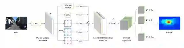 包含一个密集特征提取器,多尺度特征学习(ASPP),跨通道信息学习(纯1*1卷积分支),一个全影像编码器和有序回归优化器。Conv组成全是用1*1内核。ASPP模块包含3个3*3内核的扩张卷积层,扩张比率分别是6,12和18。网络的监督信息是用SID策略离散化输出的深度值。用一个端对端的有序回归训练损失优化整个网络。