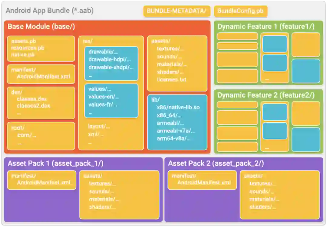 包含一个基本模块、两个动态功能模块和两个 Asset Pack 的 Android App Bundle 的内容