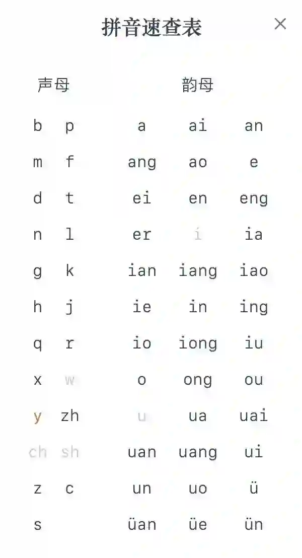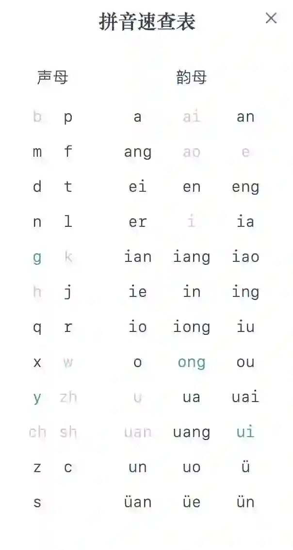 点击「速查表」可以查看声母韵母表,灰色的拼音不会在正确答案中出现,要避免使用。开局只得到一个声母提示,于是我想从头试起。