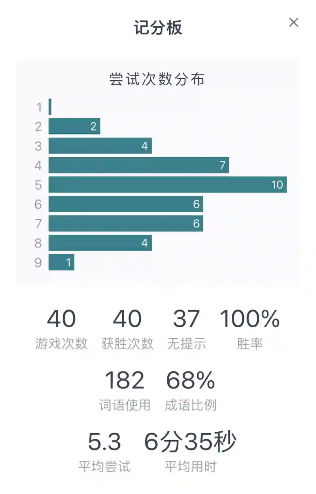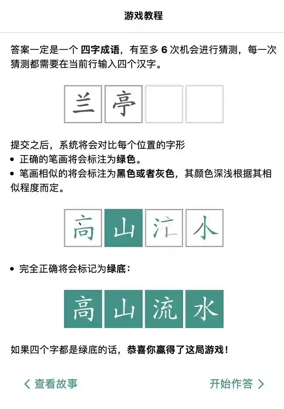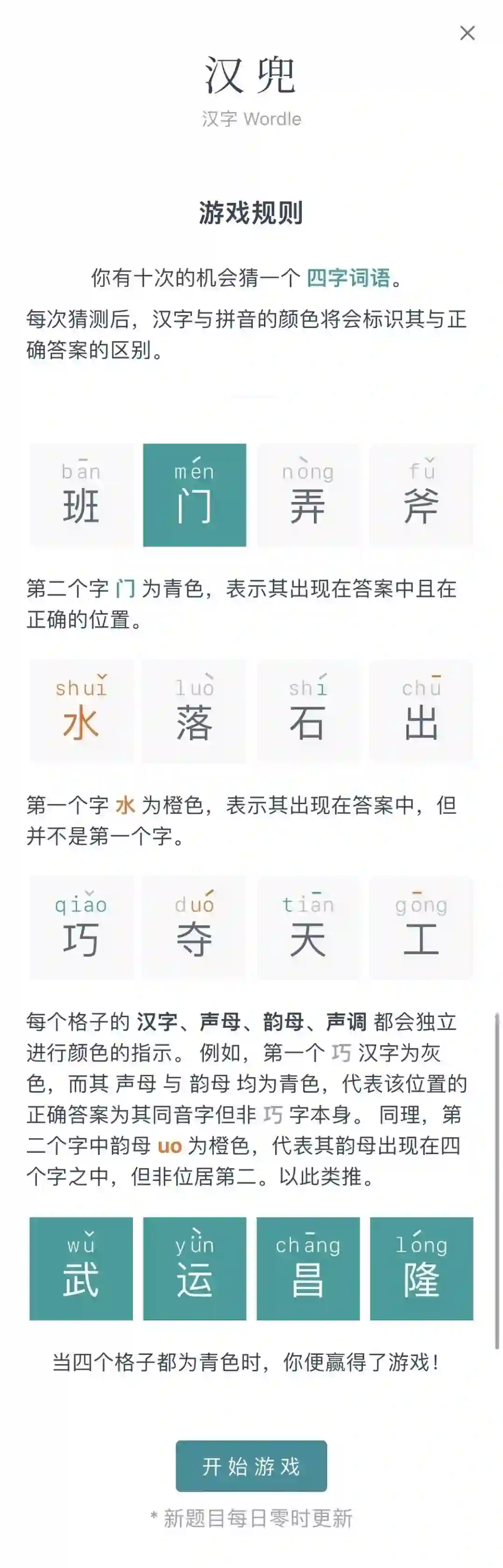 玩家有六次机会猜一个四字成语(一般是常见成语)。每次猜测后,通过笔画的颜色标识与答案的区别。