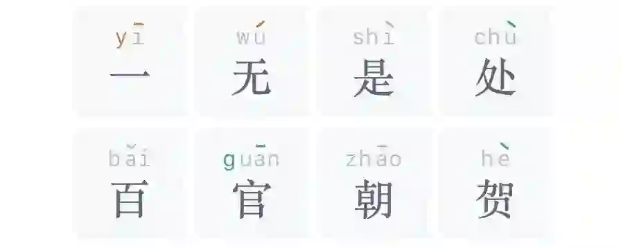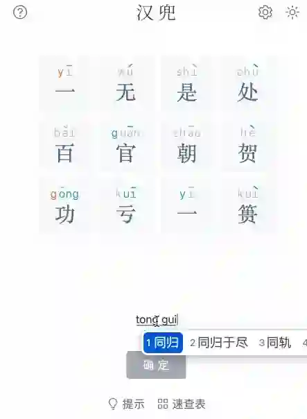 这波不亏,直接命中两个韵母一个声母,第二字读音确定为「guī」。音调也可分析出来,由「无」可知答案含有二声,由「是」可知答案仅有一个四声,由「百」可知答案没有三声,「功」「一」排除一声,于是答案音调为二一二四。