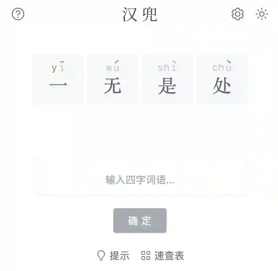 初次打开汉兜即显示游戏规则。玩家有十次机会猜一个四字词语(一般是常见成语)。每次猜测后,通过拼音、音调和汉字的颜色标识与答案的区别。