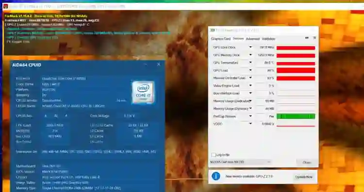 然后时 AIDA64 的 FPU 和「甜甜圈」FurMark 双烤,十分钟后,CPU 最高温度为 80 度,主频稳定在 2.1 GHz,而 GPU-Z 读出来的显卡最高温度为 69 度,核心频率稳定在 790 MHz,显存频率稳定在 1253 MHz,表现同样出色。