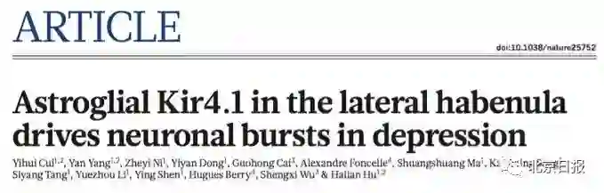 同期发表在Nature的另一篇论文中,其团队又揭示了另一快速抗抑郁分子靶点——存在于胶质细胞中的的钾离子通道Kir4.1,对引发神经元的簇状放电至关重要。