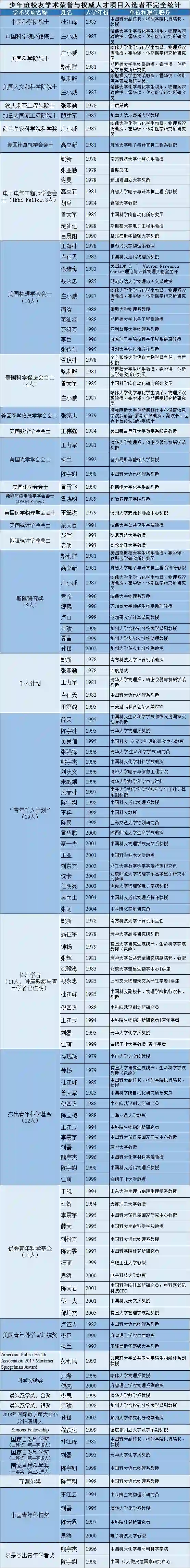 创办于1978年3月8日的中国科学技术大学少年班是中国学术菁英的黄埔军校。2018年适逢中国科大创办60周年、少年班创办40周年。中国科大新创校友基金会与少年班校友会整理了曾获得国内外荣誉称号或权威学术职位的校友不完全名单。