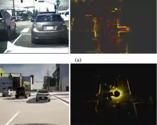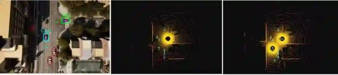 得幸于深度学习猛烈的发展,自动驾驶感知系统在近几年有了飞速的提升。尽管如此,单车的感知系统仍有其无法克服的困难。当自动驾驶汽车在遇到严重的遮挡或距离较远的物体时,往往不能有很好的表现。这种情况往往是由单车传感器在遮挡处或是远处信息太稀疏导致的,很难被算法克服。针对这种单车物理上的限制,工业界和学术界开始研究如何利用多车之间的视觉信息传递来彻底解决遮挡问题并增加感知视野。如图一所示,ego汽车(绿色框)正在一个T型的交叉口准备左转,此时正有两辆车向它这个方向快速驶来,但是由于停在路边的汽车,它的激光雷达根本无法感知到这两辆驶来的汽车(如图一中间所示),很可能会造成重大事故。但幸好此时有另外一辆自动驾驶汽车在另一侧经过(图一左被蓝色方框标出的CAV1),它能很好地捕捉到这两辆驶来汽车的信息(图一右所示),并且将该信息传递给ego, 从而避免车祸的发生。