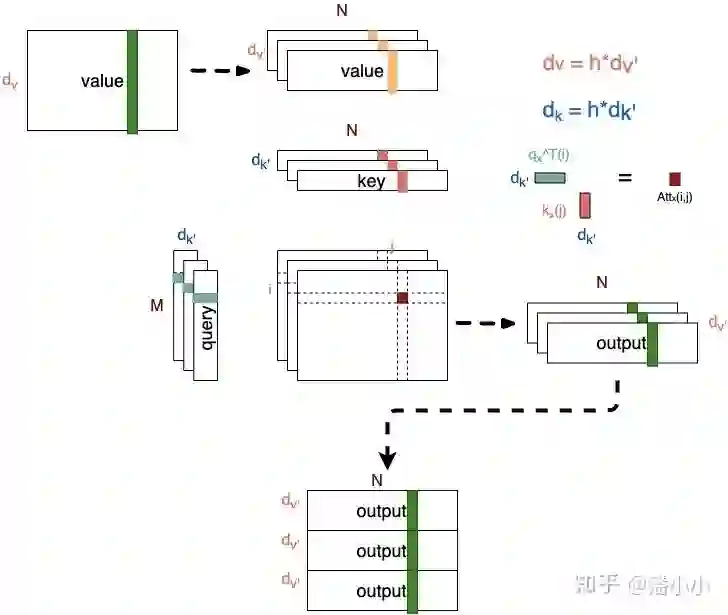 从上图可以看出, 和 之间的attention score从1个变成了h个,这就对应了h个子空间中它们的关联度。
