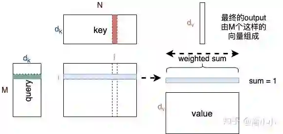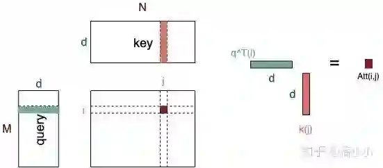 如上图所示, , 分别是query和key,其中,query可以看作M个维度为d的向量(长度为M的sequence的向量表达)拼接而成,key可以看作N个维度为d的向量(长度为N的sequence的向量表达)拼接而成。