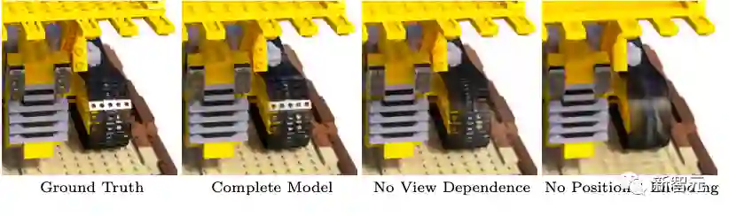 从图中可以观察到,去除位置编码会大大降低模型表示高频几何和纹理的能力,最终导致外观过度平滑。