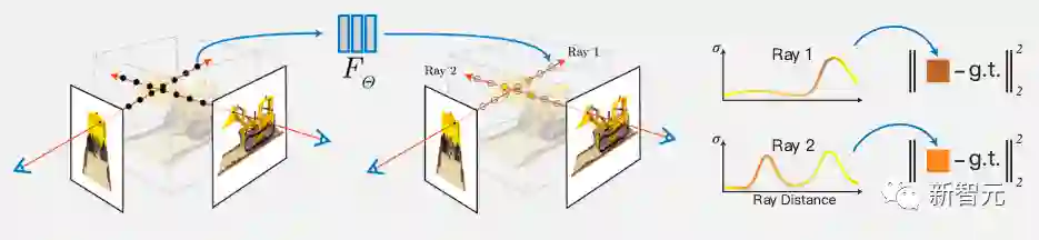 通过沿着相机光线查询5D坐标来合成视图,并使用经典的体绘制技术(volume rendering)将输出的颜色和密度投影到图像中。