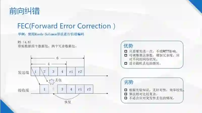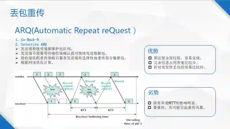 所以在一个真实的系统中,选择性重传是首选,因为音视频的大部分场景是频密的,但是可能也要结合一些 Go-Back -N 的做法。发一些确认机制,这样才能把重传做得更加完备。另外所有的重传都要至少等一个网络往还时,因为无论是确认丢包还是反馈收包情况,都需要一个网络往返时,所以它的弱点是,它受网络往返时影响比较大,如果控制不好,有可能造成重传风暴。优势是算法计算复杂比较低,且容易实现。另外,因为它有很大的针对性,无效的重传包会比较少,针对突发性的丢包会有比较好的效果。