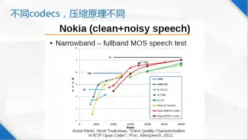 图 6 是一个编码器,横轴是码率,纵轴是它的质量,中间是各种音频编解码器的表现。你会发现线性预测的方式能够在低码率上提供比较好的质量,但是在 20K 左右的时候就没有曲线了,因为它不支持那么高的码率。然后看 MDCT 编码,它可以在比较高的码率上达到近似透明的音质。音频编码器是有不同的编码原理在里面的,像这种 LP Mode 是模拟人的发声模型,既然有了数学建模,它的特征是能够在一个比较低的码率上提供一个比较可靠的质量。