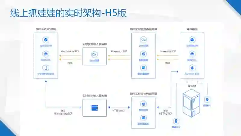 接下来是娃娃机的 H5 架构图。在推流方面和 APP 版本没有太大的区别,娃娃机一侧还是走的私有协议。不同的地方是因为私有协议没有办法直接让 H5 拉到流,所以中间会加入一个媒体网关,作用是把我们的私有协议翻译成 H5 可以识别的码流格式,然后 H5 端通过 websocket 方式把这路流拉下来,这里需要媒体网关做到超低延时的转换。