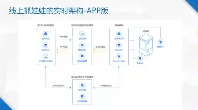 图 3 是线上娃娃机的 APP 版本的架构图,这里的是特色是线上娃娃机可以实时推两路视频流,上机玩家可以随时任意去切其中一路画面去看。这两路视频流首先通过我们超低延时服务器集群,同时上机玩家也可以推一路流上去,可以给围观观众方看到这个人在抓娃娃时候的一些表情、反应、语言,增加一种互动性。此外,玩家需要通过手机远程操控娃娃机,因此还需要实时信令的分发。