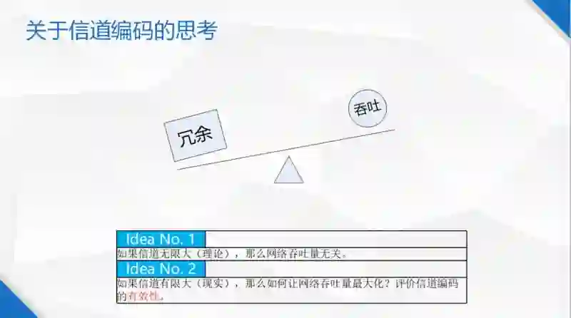 还有信道编码有效性的判断,衡量它是否好,就是加了多少冗余,冗余中有多少没有被利用好,如果这些冗余像刚才那个例子那样,6 包带 2 包的冗余,刚好丢掉 2 包,整个包都恢复出来了都使用到了,那就是百分之百的冗余都有效。如果 4 包信息丢了 1 包,却带了 2 包荣誉,其中 1 包就没有效果。所以想要做一个好的系统,应该先想到如何评价这个系统的好坏。