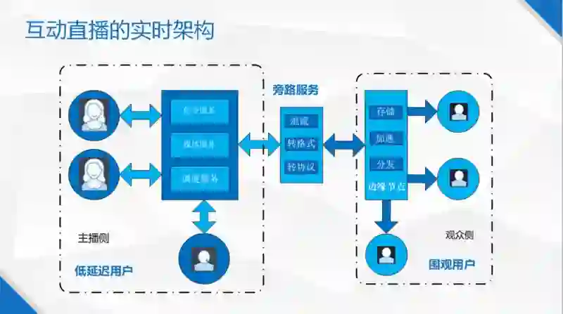 图 2 是即构互动直播的实时架构图,我们把互动直播分为两部分,一个是主播侧,需要更低的延迟,另一侧是普通观众,对延时不太敏感,但对流畅性敏感,中间通过一些旁路的服务把这两个集群(一个集群叫超低延迟集群,另外一个集群叫围观集群)连接起来。