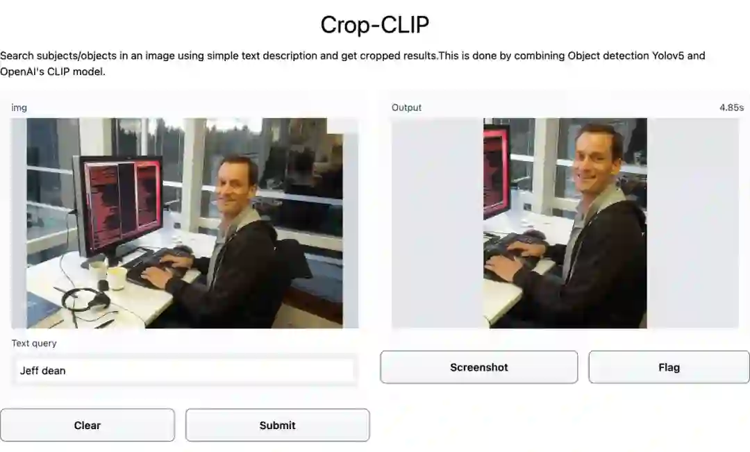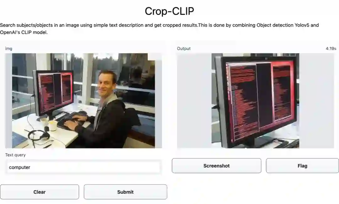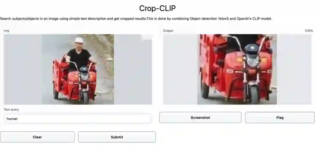 和目标检测器 YOLOv5 相结合之后,CLIP 在语义搜索图像的基础上增加了裁剪能力,变身 Crop-CLIP。
