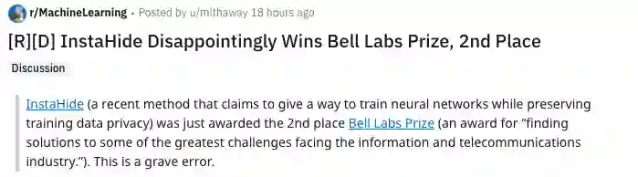 在reddit的一篇贴子上,有人称,「InstaHide令人失望地获得了贝尔实验室奖第二名,这是一个严重的错误。」