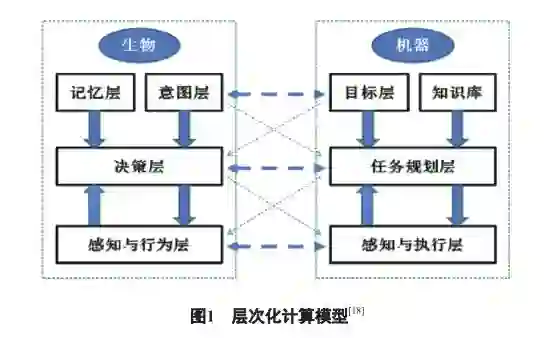 本节将对若干典型的相关工作进行介绍。本课题组最近结合生物与机器感认知方面的相似性,曾提出一个层次化的计算框架[17-18],如图1所示。在该框架中,生物端包含记忆与意图层、决策层和感知与行为层,机器端包含目标层和知识库、任务规划层和感知与行为层。机器端三个层次的研究在人工智能领域已非常多,下面将重点在如何与生物端进行交互方面,对若干典型研究进行介绍。