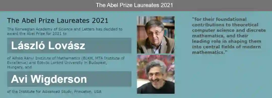 北京时间 2021 年 3 月 17 日晚,2021 年度阿贝尔奖揭晓。挪威科学与文学院将奖项授予了匈牙利厄特沃什 · 罗兰大学教授 László Lovász 和美国普林斯顿高等研究院教授 Avi Wigderson,以表彰他们「对理论计算机科学和离散数学的基础性贡献,以及在将这两个学科塑造成为现代数学核心领域过程中发挥的主导作用」。