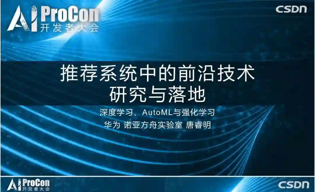 【导读】9月6-7日,2019中国AI开发者大会(AI ProCon 2019) 在北京拉开帷幕。本次大会由新一代人工智能产业技术创新战略联盟(AITISA)指导,鹏城实验室、北京智源人工智能研究院支持,专业中文IT技术社区CSDN主办。华为诺亚方舟实验室推荐与搜索项目组资深研究员唐睿明在会上作了题为“推荐系统中的前沿技术研究与落地:深度学习、强化学习与AutoML”的报告,本文整理了报告的主要内容,并分享了报告29页PPT,非常值得学习。