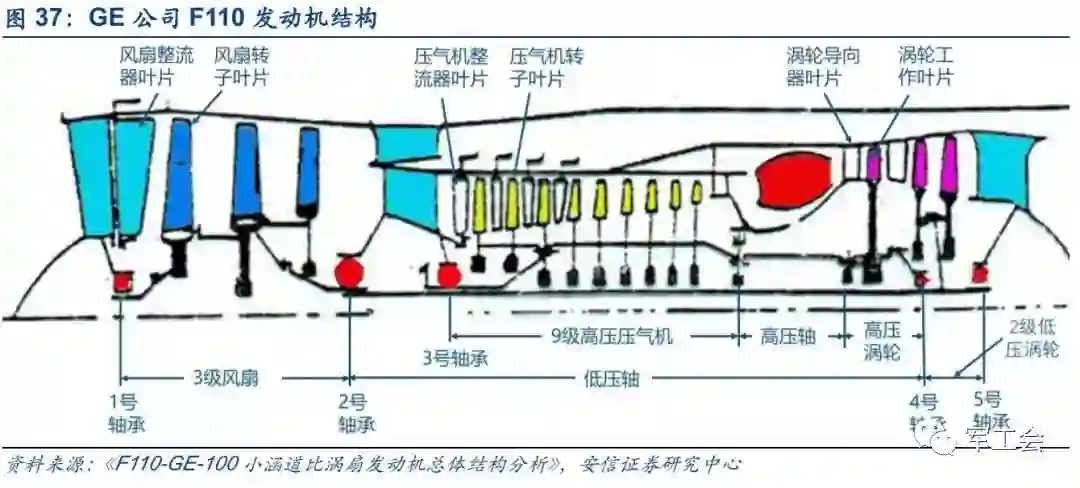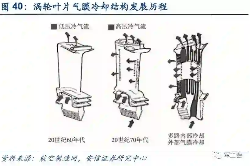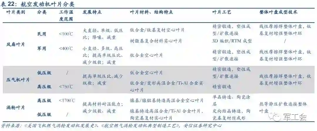 军用小涵道比涡扇发动机为了在迎风面积限制条件下提高外涵流量,一般采用多级高压比设计,叶片直径和工作环境与压气机前几级基本相当,材料与工艺的选用基本相同,主要选用钛合金空心叶片,目前钛基复材空心叶片正在研发中。