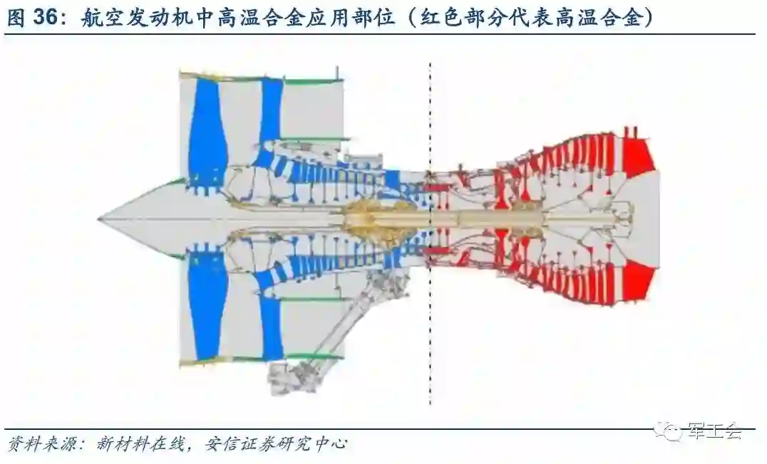 高温合金主要用于发动机四大热端部件:燃烧室、导向器、涡轮叶片和涡轮盘,此外,还用于机匣、环件、加力燃烧室和尾喷口等部件。