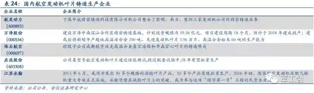 在航空发动机铸件领域,常规铸件和非单晶叶片铸造以中航重机和航发动力为主;单晶叶片的铸造主要以研究机构为主,比如沉浸于这个领域已久的航材院、金属所等材料研究。近几年不少民企也积极进入这个领域,逐渐成为这个领域不可忽视的一股力量,比如万泽股份、应流股份、炼石航空等公司。