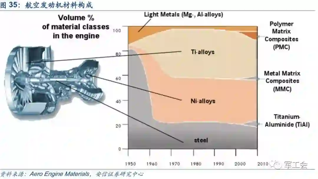 根据Global Commercial Aero Turbofan Engine Market数据,镍合金、钛合金和特钢是航空发动机的主要材料,分别占比40%,30%及25%。陶瓷基复合材料等新兴材料,因其优良属性而在未来有着巨大的应用空间。