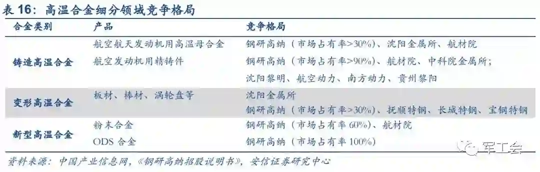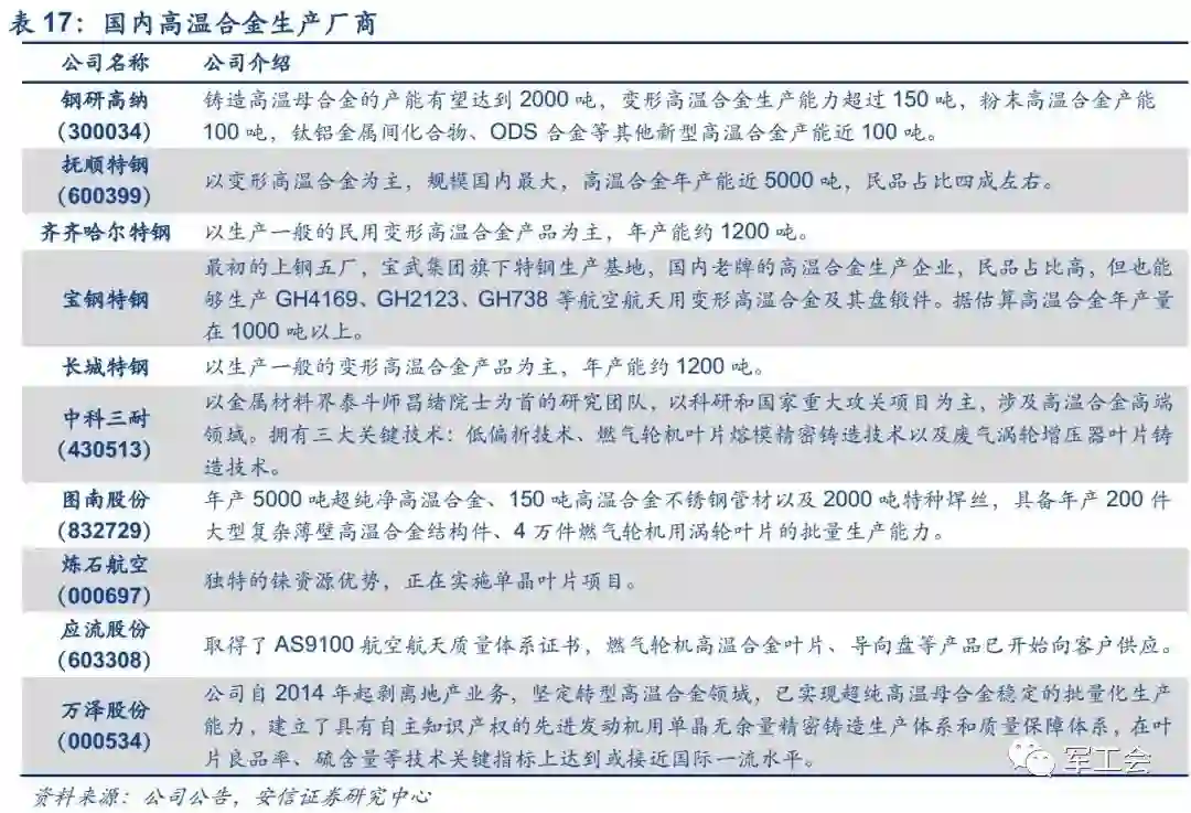 经过50多年发展,我国已经形成了比较先进,具有一定规模的生产基地。国内厂商主要包括钢研高纳、抚顺特钢、齐齐哈尔特钢、宝钢特钢、长城特钢、中科三耐、图南股份、炼石航空、应流股份和万泽股份等企业,这些大型钢企拥有大吨位冶炼设备以及变形加工能力,主要生产在航空航天领域用量最大的变形高温合金,因此在大批量生产高温合金母合金、板、棒、锻材上有很大的优势。