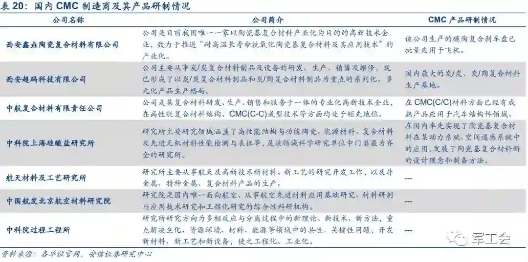国内CMC材料制备商:西安鑫垚陶瓷复合材料有限公司、西安超码科技有限公司、中航复合材料有限责任公司等多家公司公司均有CMC相关业务。根据张立同院士2006年在第十四届全国复合材料学术会议上的论文中的表述“我国已经打破国际封锁,自主攻克了碳化硅陶瓷基复合材料构件批量制造技术,但是由于缺少高性能SiC纤维,目前只能用碳纤维代替”判断,碳化硅纤维的量产将直接推动相关CMC材料的量产,进而推动我国碳化硅陶瓷基复合材料的大量应用。