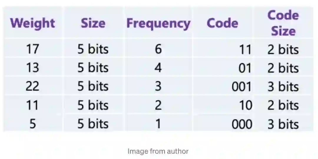 通过使用霍夫曼编码对模型进行压缩,使用01编码 weights,把最常出现的权重用较少的 bit 去编码,如下图所示,我们有已经被量化的权重矩阵: