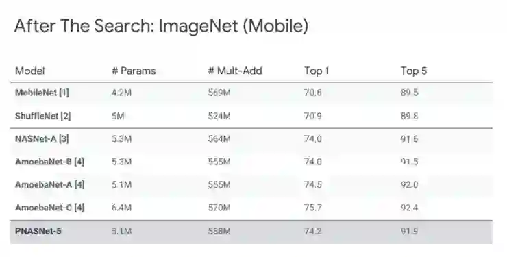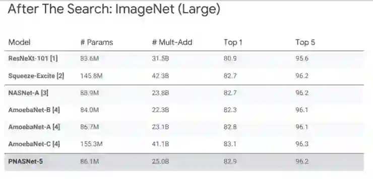 其中 PNASNet-5 是我们最终搜索出来的结果。而我们找到这样一个结构之后,仅仅确保它在过程中的表现好还不够,我们还要在搜索完成后,将 N 和 F 增大,在 CIFAR-10 和 ImageNet 上进行训练和测试。这里的问题是,我们找到的网络结构在最好的 benchmark datasets 上的表现是怎么样的。