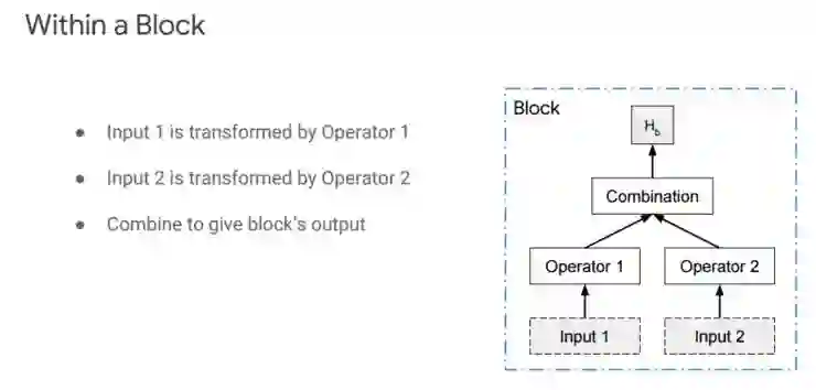 而一个 Block 大概是下图右边的这样一个结构,这是整个网络最小的形成段,Input1 通过 Operator1 transform 一下,Input2 通过 Operator2 transform 一下,二者通过一定方法 Combine 形成一个 Block。