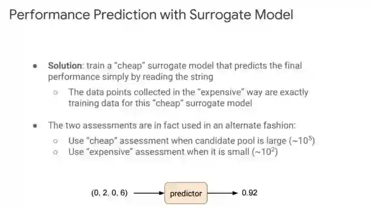 然而这种 Idea 是难以预测的。基于此,我们的解决方案是引入了一个「cheap」surrogate model,它读入一个结构,比如下图中的 (0, 2, 0, 6),将其直接放入到 predictor 中去预测 final performance,这样的一个 predictor 是很轻便的,我们的想法就是用这个 surrogate model 完全代替整个训练过程。