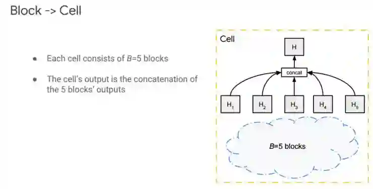 从 Block 到 Cell 的过程,是指一个 Cell 由 5 个 Block 组成,整个 Cell 的 output 是 5 个 Block 的 output 的 concatenation(连接)。如右图,H 代表 Cell 的 output,H1 到 H5 代表了五个 Block 的 output。